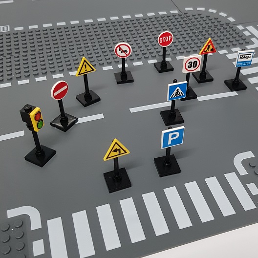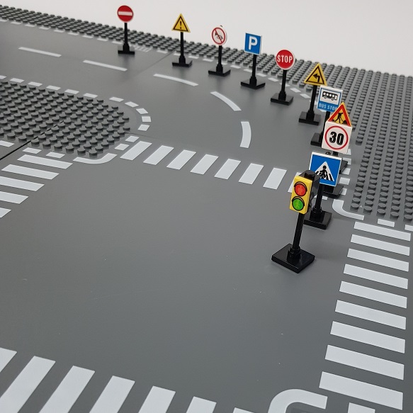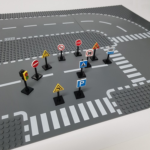 Spezifikationen 20031 bricksNblocks® Stadtgrundplatten Kurve, gerade Straße, Kreuzung und T-Kreuzung mit Verkehrszeichensatz, kompatibel mit Lego und Sluban: