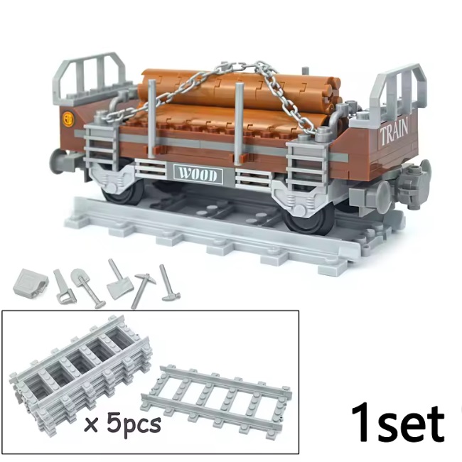 | Bausteine-Eisenbahnwagen für Baumstämme, mit 5x Schienen und Werkzeug, kompatibel mit Lego und Mould King, ca. 151 Bausteine. Dieser Holztransportwagen ist eine schöne Ergänzung zu den verschiedenen Ganzzuggleisen unter anderem von Lego und Mould King. Der Wagen ist standardmäßig mit einer Magnetkupplung ausgestattet und das Set wird mit 5 geraden Gleisen geliefert.