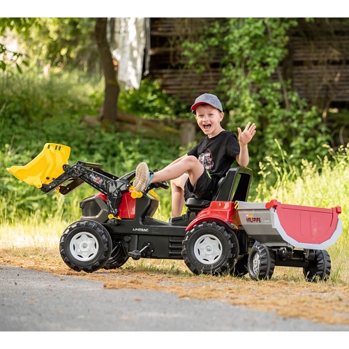 Rolly Toys rollyFarmtrac Premium II Lintrac Trettraktor mit Frontlader. De rollyFarmtrac Premium II Lintrac van Rolly Toys is een hoogwaardige traptractor die speciaal is ontwikkeld voor kinderen van 3 tot 8 jaar. Hij heeft een in lengte en hoogte verstelbare zitting waardoor hij met het kind mee kan groeien en een optimale zitpositie altijd gegarandeerd is. De motorkap kan worden geopend om toegang te krijgen tot het opbergvak onder de motorkap. Kleine spullen kunnen hier veilig worden opgeborgen.