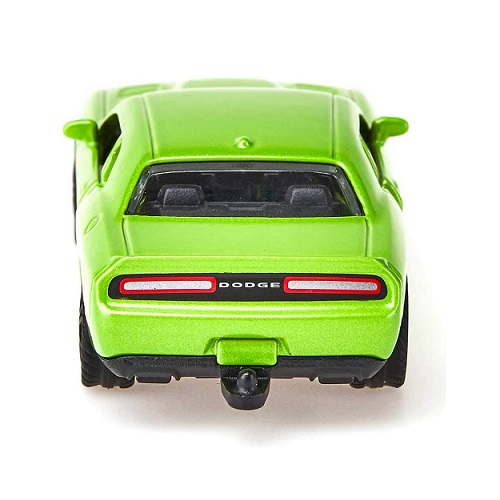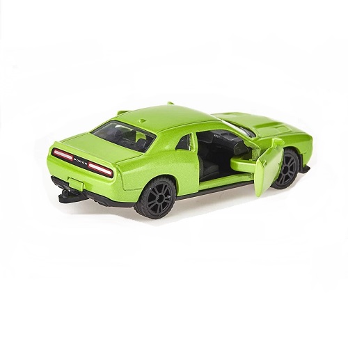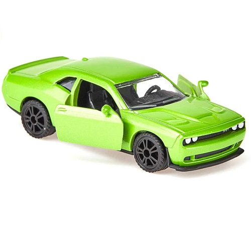 | Siku 1408 Dodge Challanger SRT Hellcat. Der Dodge Challenger SRT Hellcat von Siku ist ein Dampfhammer im knallgrünen Gewand. Der V8-Motor unter der Haube mobilisiert 700 PS. Der Dodge Challenger SRT Hellcat hat Breitreifen aus gummiertem Material. Die Scheinwerfer verleihen dem Dodge einen rassigen Look. Die Türen des Autos können geöffnet werden. Der Dodge Challenger SRT Hellcat ist ungefähr im Maßstab 1:50 gehalten und lässt sich daher gut mit anderen Siku-Spielzeugen im gleichen Maßstab kombinieren. Alle Anhänger im gleichen Maßstab können an das Auto gekoppelt werden.