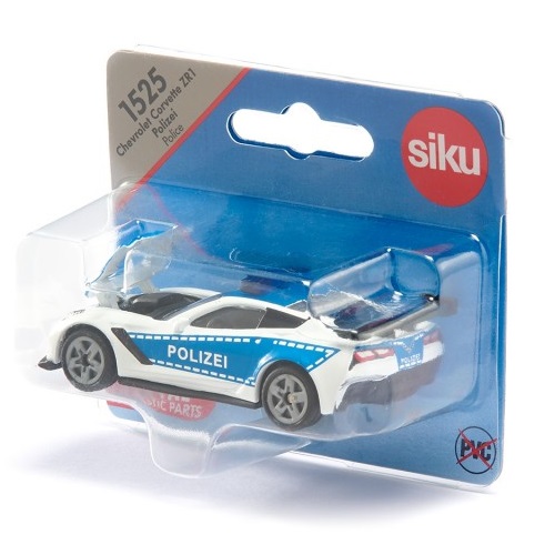 | Siku 1525 Chevrolet Corvette ZR1 Polizei. Flüchtende Ganoven haben wenig Chancen, dieser Straßenflitzer schnappt sie alle: Mit der Chevrolet Corvette ZR1 gewinnt die deutsche Polizei garantiert jede Verfolgungsjagd. Das amerikanische Muscle-Car mit V8-Motor bringt enorme Power auf die Straße und ist abseits der Strecke kaum zu schlagen. Das aerodynamische Design, die Metallkarosserie, Heckspoiler, Sportfelgen mit Gummibereifung und das blaue Blinklicht machen das weiß-blaue Polizeiauto zu einem echten Powermodell. Die Motorhaube öffnet sich für den Blick auf die Energiequelle der Chevrolet Corvette ZR1, die als Polizeiauto der Star der Kinderzimmerflotte ist. Das Polizeiauto Chevrolet Corvette ZR1 ist ungefähr im Maßstab 1:50 gehalten und lässt sich daher gut mit anderen Siku-Spielfahrzeugen im gleichen Maßstab kombinieren.