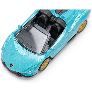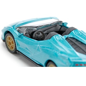 | Siku 1571 Lamborghini Sián Roadster. Der Sián Roadster ist Lamborghinis erstes Hybrid-Supersport-Cabriolet mit der weltweit ersten Hybrid-Superkondensator-Technologie. Kein Zweifel: Dieses Siku-Spielzeugauto ist ein MUSS für jede Spielzeugflotte! Natürlich muss man sich den gewaltigen Sound des 800 PS starken V12-Motors – Lamborghinis bisher stärkster Motor – trotzdem vorstellen oder ihn beim Spielen selbst nachbilden. Der Rest des Siku Sián Roadster-Modells entspricht 1:1 dem Original-Sportwagen: Die coole, pfeilförmige Form ist perfekt der robusten Metallkarosserie nachempfunden und in leuchtendem Metallic-Türkis gehalten. Abgerundet wird der sportliche Look durch die eleganten, goldfarbenen Felgen, die dank der Gummilauffläche auch bei Höchstgeschwindigkeit stets optimalen Grip bieten. Das Fahrgestell und der Innenraum bestehen aus schwarzem Kunststoff und sind durch das offene Dach perfekt sichtbar. Die Scheinwerfer in der typischen Y-Form sind originalgetreu bedruckt, ebenso die Rückleuchten.
