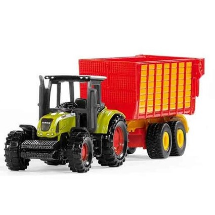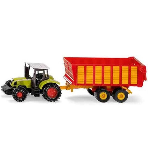 | Siku 1650 Claas mit Silagewagen. Extrem starke Bauernkombination im kleinen Maßstab zum günstigen Preis. Der Silierwagen mit Tandemachser-Fahrgestell wird von einem leistungsstarken Claas-Traktor gezogen. Die Klappe an der Rückseite des Behälters kann geöffnet werden. Der Siku Claas Traktor mit Silagewagen besteht aus Metall mit Kunststoffteilen. Der Traktor mit Silierwagen ist ungefähr im Maßstab 1:87 und lässt sich daher gut mit anderen Siku-Spielfahrzeugen im gleichen Maßstab kombinieren. Der Traktor hat eine Anhängerkupplung, mit der Sie auch andere Siku-Anhänger an den Traktor hängen können. Schön ist es auch, den Siku Claas mit Silagewagen mit Produkten von Kids Globe im Maßstab 1:87 zu kombinieren.