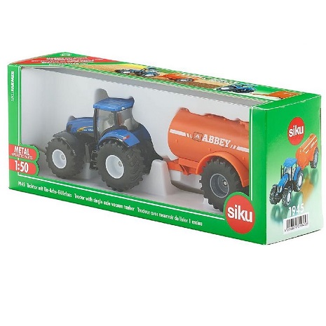 | Siku 1945 New Holland Traktor mit ein-achs-güllefass. Siku New Holland Traktor mit Fasswagen der Marke Abbey aus Irland. Diese farbenfrohe, hochattraktive Kombination aus Metall und Kunststoff ergänzt das Siku-Sortiment an Landwirtschaftsmodellen im Maßstab 1:50 im Bereich Düngung. Für zusätzlichen Spielwert ist der Deckel des Tankwagens aufklappbar, sodass der Tank mit Wasser gefüllt werden kann. Befindet sich Wasser im Tank, kann dieses durch den Stöpsel auf der Rückseite wieder abgelassen werden. Der Siku New Holland Traktor verfügt über eine Anhängerkupplung, sodass auch andere Siku-Anhänger im gleichen Maßstab angeschlossen werden können. Der New Holland Traktor mit 1-Achs-Fasswagen macht Spaß in Kombination mit anderen Spielzeugen von Siku im gleichen Maßstab und SikuWorld. Auch schön zu kombinieren mit Kids Globe-Spielzeugen im Maßstab 1:50.