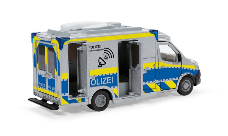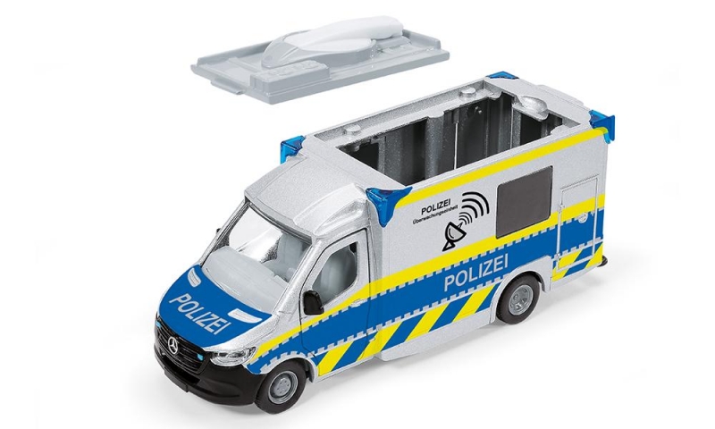 | Siku 2301 Mercedes-Benz Sprinter Polizei. Dieser schöne Mercedes-Benz Sprinter Polizeiwagen ist aus Metall mit Kunststoffteilen. Die Türen lassen sich öffnen und das Dach ist abnehmbar. Über den drehbaren Satelliten auf dem Dach funktioniert die Kommunikation in Krisensituationen oder im Katastrophenfall schnell und ungestört. Der Mercedes-Benz Sprinter Polizeiauto ist im Maßstab 1:50 gefertigt und lässt sich daher gut mit anderen Spielzeugen von Siku im gleichen Maßstab und SikuWorld kombinieren.