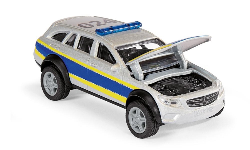 | Siku 2302 Mercedes-Benz E-Klasse all terrain polizei. Dieses schöne Mercedes-Benz E-Klasse All Terrain Polizeiauto von Siku besteht aus Metall mit Kunststoffteilen. Die Motorhaube des Siku-Polizeiautos kann geöffnet werden, um den Motor freizulegen. Auch die Heckklappe lässt sich öffnen. Die Reifen des Mercedes-Benz sind austauschbar. Das Polizeiauto hat eine Anhängerkupplung, an der alle Siku-Anhänger mit gleichem Maßstab angeschlossen werden können. Dem Mercedes-Benz Polizeiauto liegen Aufkleberbögen mit Texten in verschiedenen Sprachen bei, die Sie auf das Auto kleben können. Die Mercedes-Benz E-Klasse All Terrain Police ist im Maßstab 1:50 gefertigt und lässt sich daher gut mit anderen Spielzeugen von Siku im gleichen Maßstab und SikuWorld kombinieren.