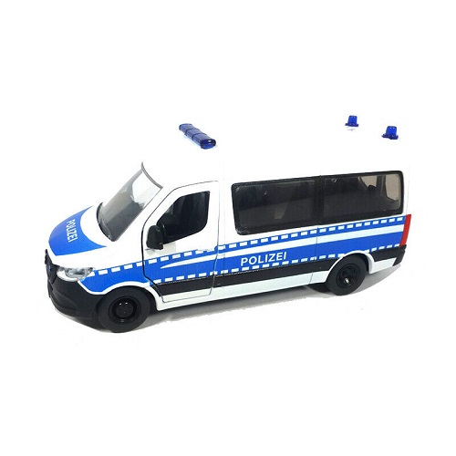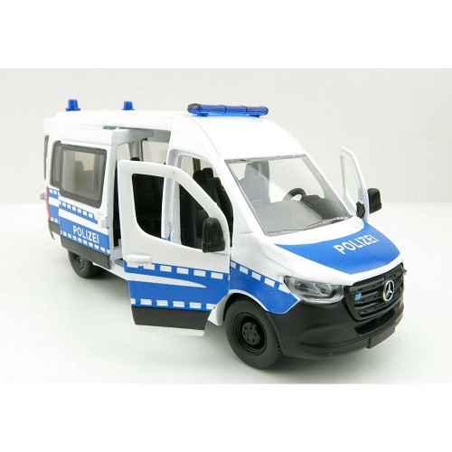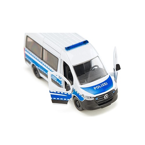 | Siku 2305 Mercedes-Benz Sprinter Polizei 1:50 (DE). Großveranstaltungen bedeuten oft großangelegte Polizeieinsätze. Mit dem Mercedes-Benz Sprinter der neuesten Generation im Bundespolizei-Design kommen Sie auf den profilierten Reifen mit Sportfelgen schnell und sicher ans Ziel. Durch die beiden zu öffnenden Vordertüren und die Schiebetür auf der rechten Seite des Siku-Fahrzeugs können die Agenten schnell ein- und aussteigen. Das Siku Mercedes-Benz Sprinter Polizeiauto ist aus Metall mit Kunststoffteilen. Das Siku-Polizeiauto verfügt über eine Anhängerkupplung, an der alle Siku-Anhänger mit gleichem Maßstab angeschlossen werden können. Der Mercedes-Benz Sprinter Polizeiauto ist im Maßstab 1:50 gefertigt und lässt sich daher gut mit anderen Spielzeugen von Siku im gleichen Maßstab und SikuWorld kombinieren.