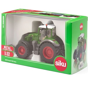 | Siku 3293 Fendt 728 Vario Traktor. Der Siku 3293 Fendt 728 Vario Traktor ist die Spielzeugversion dieses beeindruckenden Fendt Traktors. Die Spielzeugversion Siku 3293 ist sehr detailliert auf Basis des Traktors Fendt 728 Vario gefertigt und besteht aus einem gegossenen Metallsockel und ist zusätzlich mit Kunststoff-Detailteilen veredelt. Der Siku 3293 verfügt über eine abnehmbare Kabine, so dass darin ein Fahrer untergebracht werden kann. Die Vorderachse des Siku 3293 Fendt 728 Vario ist lenkbar. Die Front- und Heckkupplung des Siku 3293 Fendt 728 Vario Traktors ist serienmäßig, so dass die verschiedenen Siku Zubehörteile und Anhänger an den Spielzeugtraktor angeschlossen werden können. Die Reifen des Siku 3293 Fendt 728 Vario sind aus echtem Gummi und das macht den Traktornachbau noch realer. Die Spielzeugtraktoren von Siku im Maßstab 1:32 lassen sich problemlos mit dem Siku-Zubehör sowie den Modellen Britains und Kids Globe in diesem Maßstab kombinieren. Für den wahren Sammler von maßstabsgetreuen Modellen gibt es auch die Traktor- und Anhängermodelle von Universal Hobbies und Wiking, die von der Größe her zu diesem Siku 3293 Fendt 728 Vario Traktor passen.