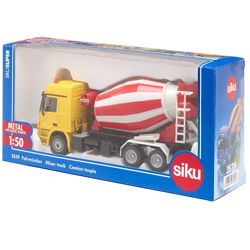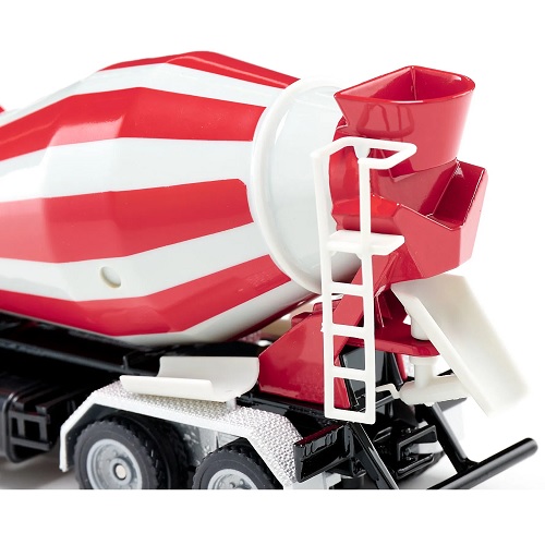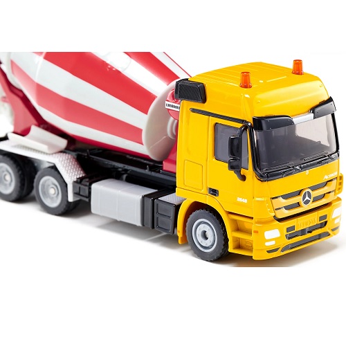| Siku 3539 Fahrmischer. Den Transportbeton zur Baustelle zu bringen, ist die Aufgabe des Fahrmischers. Das Siku 1:50-Modell mit Liebherr-Aufbau auf 3-Achs-Fahrgestell mit Mercedes Actros-Fahrerhaus meistert diese Aufgabe problemlos. Die Trommel ist drehbar und mit einem auffälligen rot-weißen Streifendesign bedruckt. Der Auslauf ist drehbar und kann durch zwei mitgelieferte Teile verlängert werden.