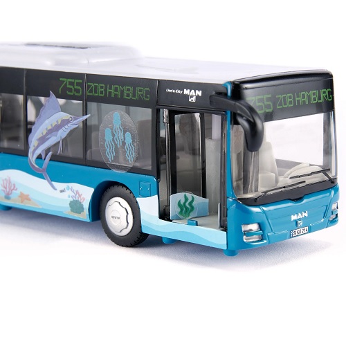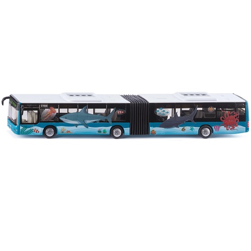| Siku 3937 Gelenkbus. Erleben Sie höchste Präzision und Liebe zum Detail mit unserem umfangreichen Siku-Busmodell des MAN Lions City in der atemberaubenden Miami-blauen Gelenkbus-Variante im Maßstab 1:50. Die Räder haben Gummilaufflächen und verleihen dem Siku-Modell ein authentisches Aussehen. Mit 3 Achsen, wobei die zweite und dritte Achse doppelt bereift sind, wird die Realität des Originals perfekt nachgebildet. Die Türen auf der rechten Seite des Siku-Fahrzeugs sind funktional und ermöglichen ein realistisches Spielerlebnis. Darüber hinaus lässt sich die Motorklappe am Heck öffnen und ein Blick in den detaillierten Innenraum werfen. Getönte Scheiben, separate Rückspiegel und ein eingebauter Kühlergrill runden das beeindruckende Siku-Spielzeugmodell ab. Die Front- und Rücklichter bestehen aus hochwertigem Kunststoff. Die Dachkonstruktion des Modells Siku 3736 ist mit detaillierten Klimaanlagen ausgestattet, die zum Originalbus passen. Als besonderes Highlight sind zwei Stickerbögen mit ultracoolen Hai- und Wassermotiven im Lieferumfang enthalten, sodass Sie das Modell Siku 3736 ganz nach Ihren Wünschen gestalten können.