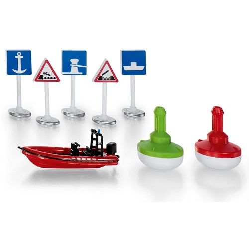 | Siku World 5592 Waterway Zubehör. Der Schiffsverkehr auf den Wasserstraßen bedarf einer Regulierung. Dazu verwenden Sie das Wasserstraßenzubehör von SikuWorld. Die Bojen sind rot und grün gefärbt, die verschiedenen Verkehrszeichen weisen auf Ankerplatz, Deich und Brücken hin. Ein Siku-Sportboot vervollständigt dieses Spielset. Gut kombinierbar mit anderen Spielzeugen von Siku im Maßstab 1:50 und SikuWorld.