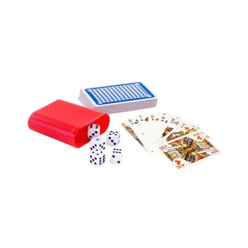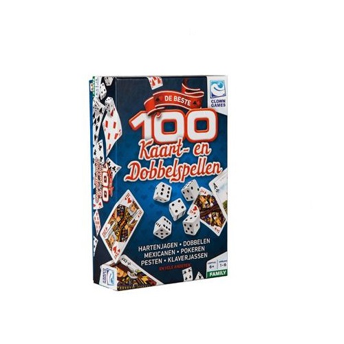 | . Met deze set Clown Games kun je ontzettend veel verschillende spelletjes spelen. Hartenjagen, pesten, yahtzee, mexicanen en nog veel meer. Met deze complete set kun je de allerleukste kaart- en dobbelspellen leren! Leuk voor een gezellige avond met de hele familie, voor onderweg of op vakantie! Inhoud: - 2 pakken speelkaarten - instructieboekje met uitgebreide uitleg voor 100 kaart- en dobbelspellen - dobbelbeker - scoreblock - 5 dobbelstenen. Voor 1 tot 6 spelers vanaf 6 jaar.