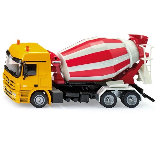 Siku 3539 - Siku 3539 Truck mixer(SK3539). Bringing the ready-mixed concrete to the construction site is the job of the truck mixer. The Siku 1:50 model with Liebherr body on 3-axle chassis with Mercedes Actros cab can easily handle this task. The drum is rotatable and printed with a striking red-white stripe design. The spout is rotatable and can be extended using two supplied parts.