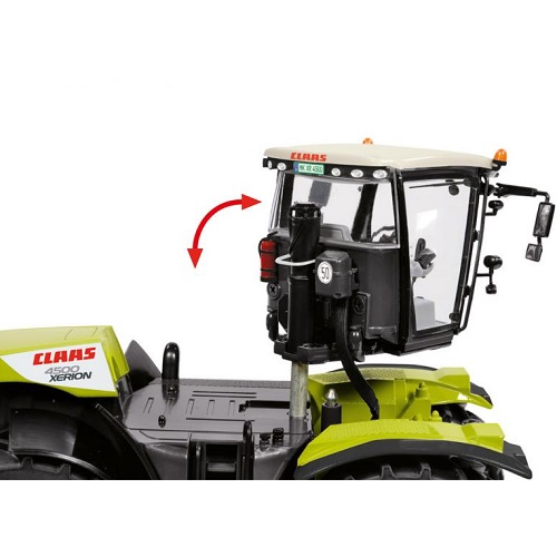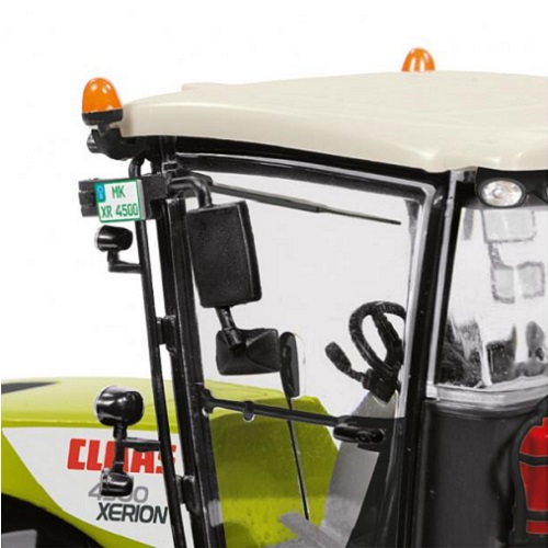 Wiking 07853 - Wiking Claas Xerion 4500 wheel drive 1:32(WK7853). The 1:32 model built by WIKING comes with a lower assembly entirely made from metal, while the bonnet and the frame around the engine are manufactured with die-cast zinc elements. The radiator grille is inserted as a separate piece made of plastic, the lights inserted at the rear are also true to the original. The rear fenders are made of metal, while the fender flares have been highlighted in colour. The wheeled version of the Xerion is furnished with front fenders that are made of plastic - as are the top link, tank, exhaust, access point, and mirror. The lower link and the front axle mechanism manage to convince with the rugged stability of their metal construction. In line with the philosophy WIKING has been pursuing for years, the cab boasts the highest possible detail both inside and out – all control elements available to the Xerion driver have been reproduced true to scale. The headlamps have been imprinted for added emphasis, while the two all-round lights found on the front right and left of the cab have been attached. The design of the 1:32 precision model allows for a highly detailed swing axle as well as a steerable front axle. What is more, the upper and lower links have been designed to move at the front and rear, while both exterior mirrors can be swung far and fully functional to the right and left. It is, of course, also possible to open the left door and adjust the height of the rear coupling. The cab can rotate in order to demonstrate the mode of operation behind the system tractor principle. The labelling leaves nothing to be desired and even includes the “50 k/m” maximum speed notice found on the wheel version.